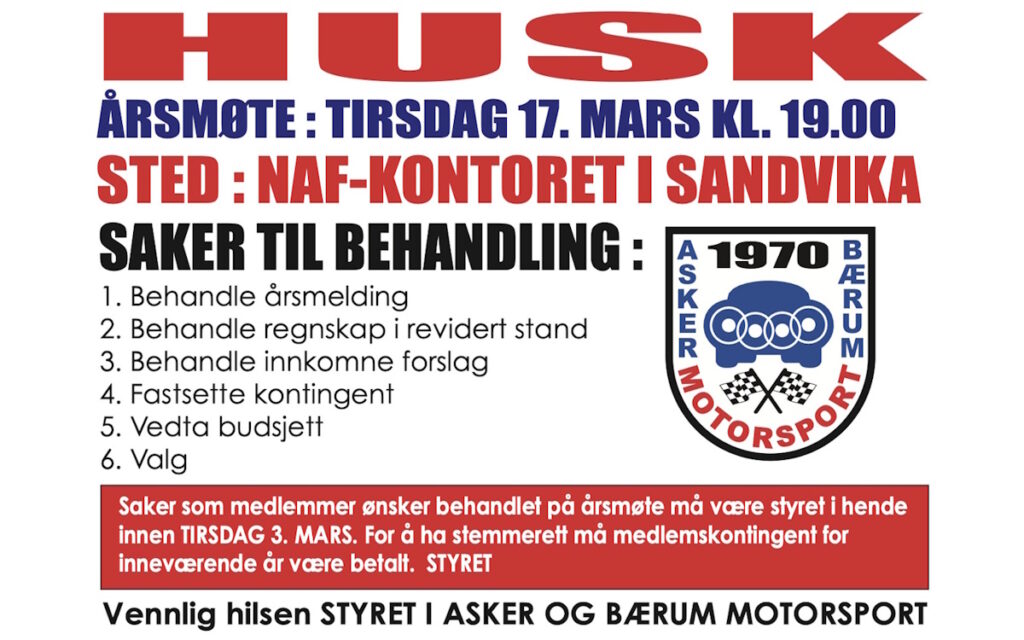 Innkalling til årsmøtet 2026 Tirsdag 17. Mars Sandvika kl 19:00 Saker må være ihende innen 3 mars 2026 For å ha stemmerett…