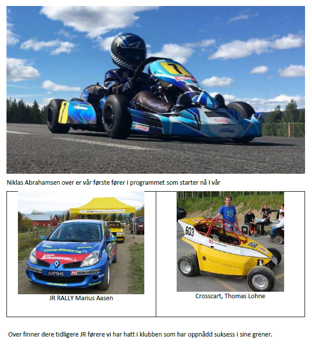 Vi ønsker å fokusere på planlagt oppfølging av et utvalg av våre unge aktive etter toppidrettens prinsipper. Hvordan kan vi bistå til en positiv utvikling av unge utøvere i bilsport.