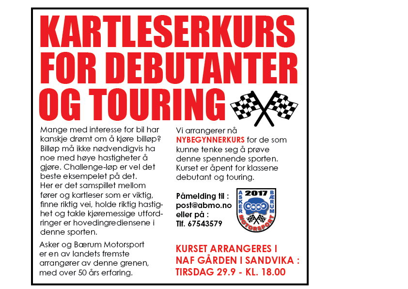 Oppgi navn epost og mobil samt oppgi om du er nybegynner eller eventuelt hva du har kjørt før. Ytterligere info kontoret: 67543579.